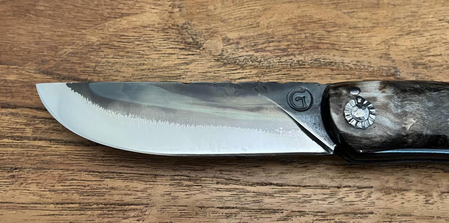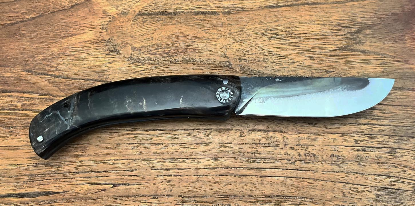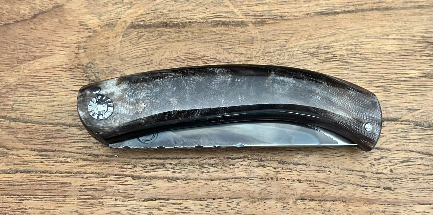 Accueil / Curnicciolu / Curnicciolu lame carbone XC75, corne de bélier Curnicciolu lame carbone XC75, corne de bélier190€ Curnicciolu, lame en acier carbone XC75 et manche en corne de bélier, réalisé par Jean-Noël Guillaumin, pièce unique. Lame : 9,5 cm En stock quantité de Curnicciolu lame carbone XC75, corne de bélier Acheter maintenant UGS : J-NO 219 Catégories : Curnicciolu, Jean-Noël GUILLAUMIN, Nouveautés Product ID: 7979 Produits similaires Curnicciolu lame Damas, corne de bélier 390€ Acheter maintenant Cursinu lame carbone XC75, bois d’olivier sculpté 240€ Acheter maintenant Curnicciolu, lame carbone forgée, corne de chèvre 750€ Acheter maintenant Cursinu lame carbone XC75, bois d’olivier 190€ Acheter maintenant