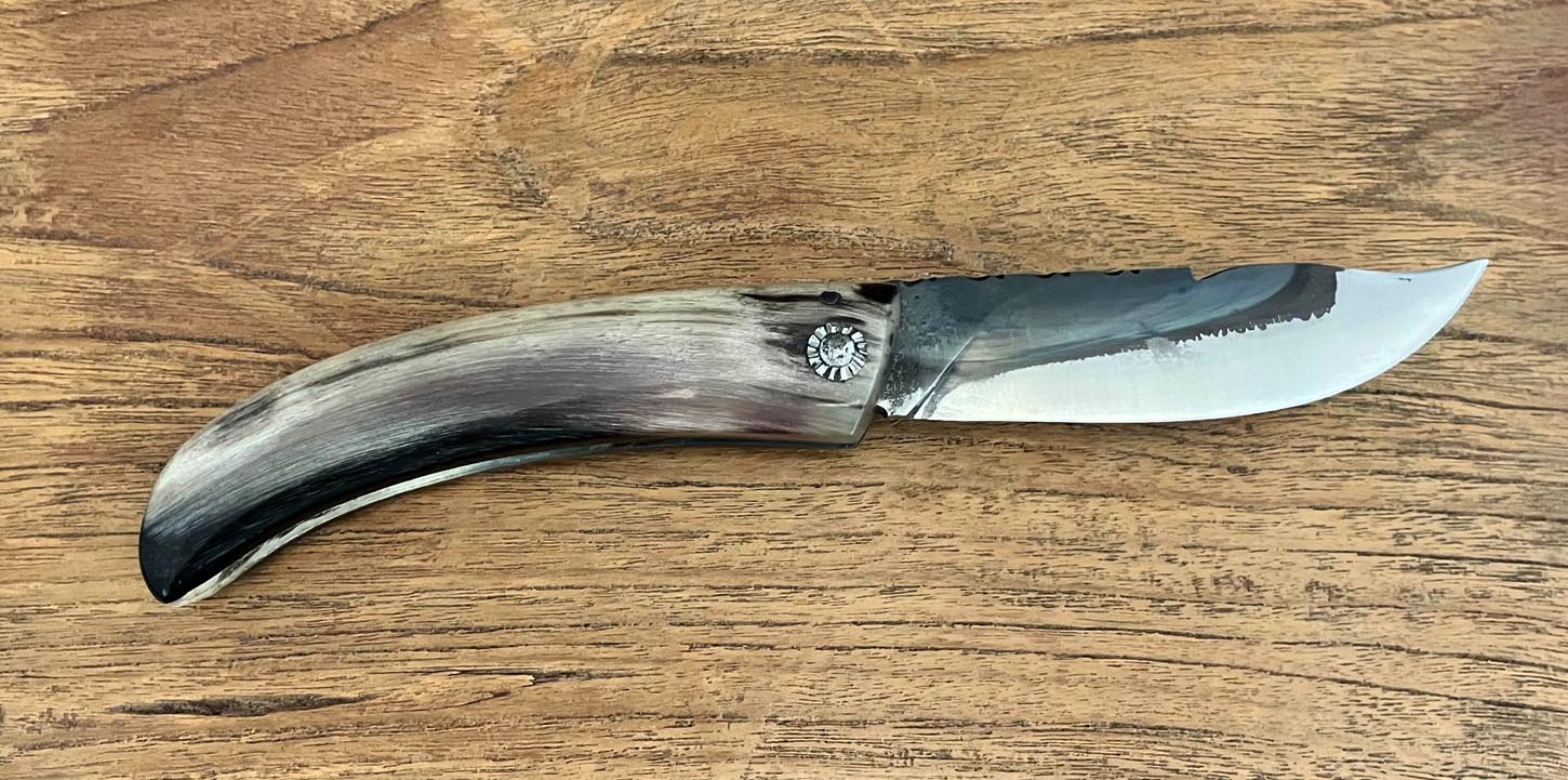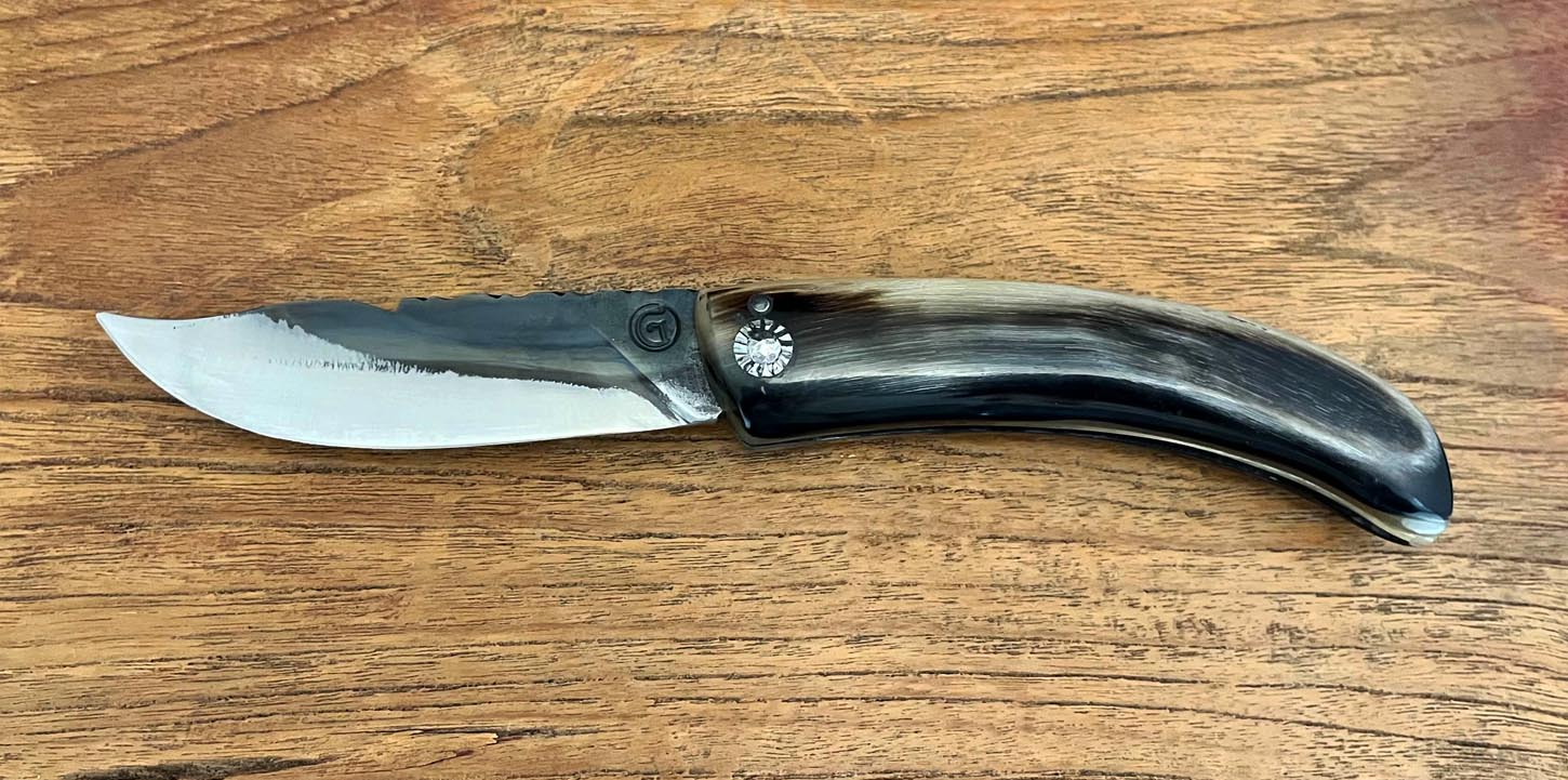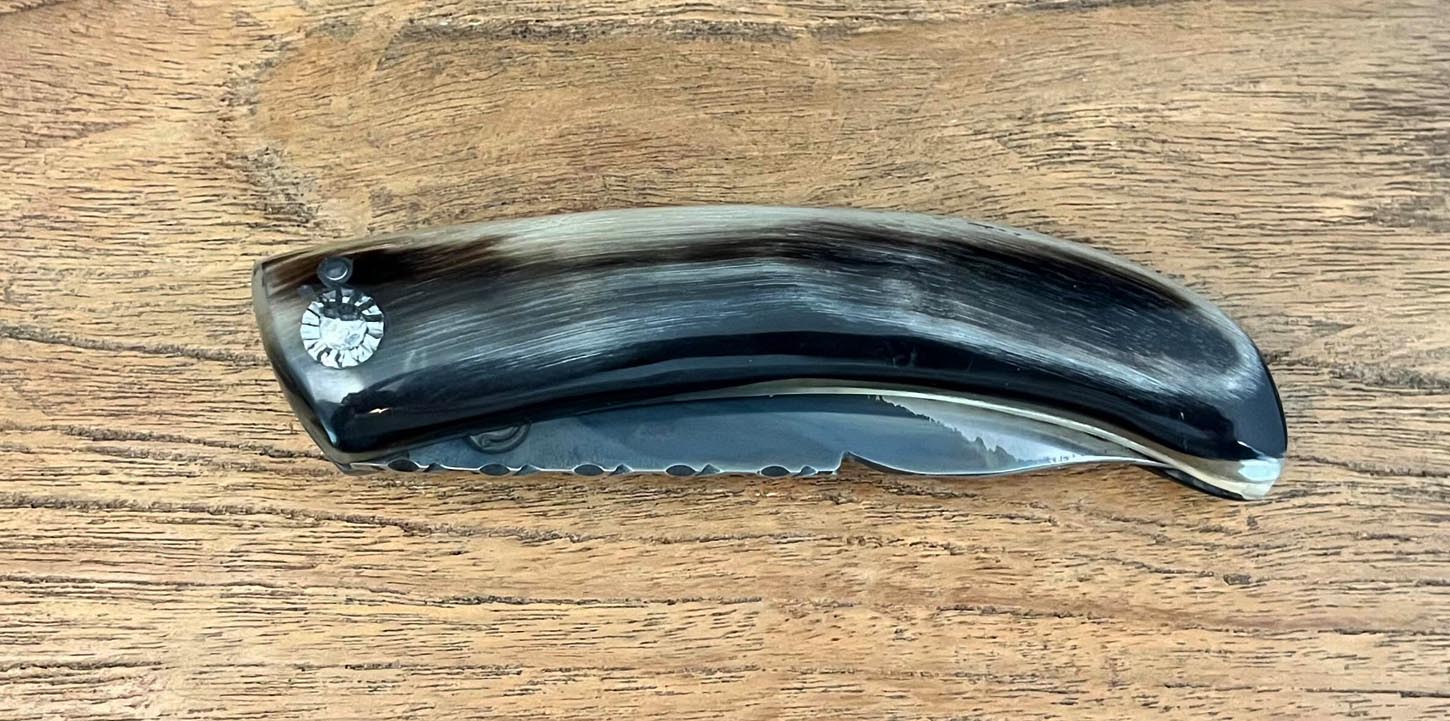 Accueil / Curnicciolu / Curnicciolu lame carbone XC75, corne de bélier Curnicciolu lame carbone XC75, corne de bélier190€ Curnicciolu, lame en acier carbone XC75 et manche en corne de bélier, réalisé par Jean-Noël Guillaumin, pièce unique. Lame : 9 cm En stock quantité de Curnicciolu lame carbone XC75, corne de bélier Acheter maintenant UGS : J-NO 220 Catégories : Curnicciolu, Jean-Noël GUILLAUMIN, Nouveautés Product ID: 7984 Produits similaires Curnicciolu lame carbone XC75, corne de bélier et cabochon en phacochère 220€ Acheter maintenant Curnicciolu, lame Damas 160 couches, corne de chèvre 900€ Acheter maintenant Curnicciolu, lame carbone forgée, corne de chèvre 700€ Acheter maintenant Curnicciolu modèle de la vallée d’Ascu lame carbone XC75, corne de bélier 220€ Acheter maintenant