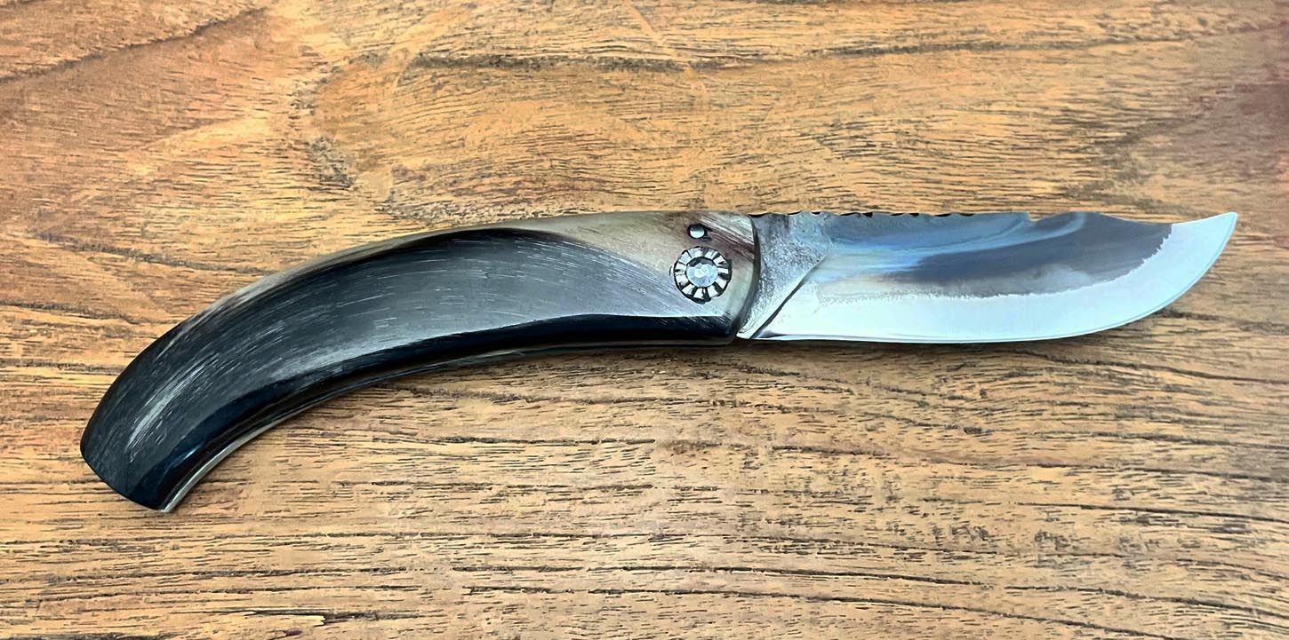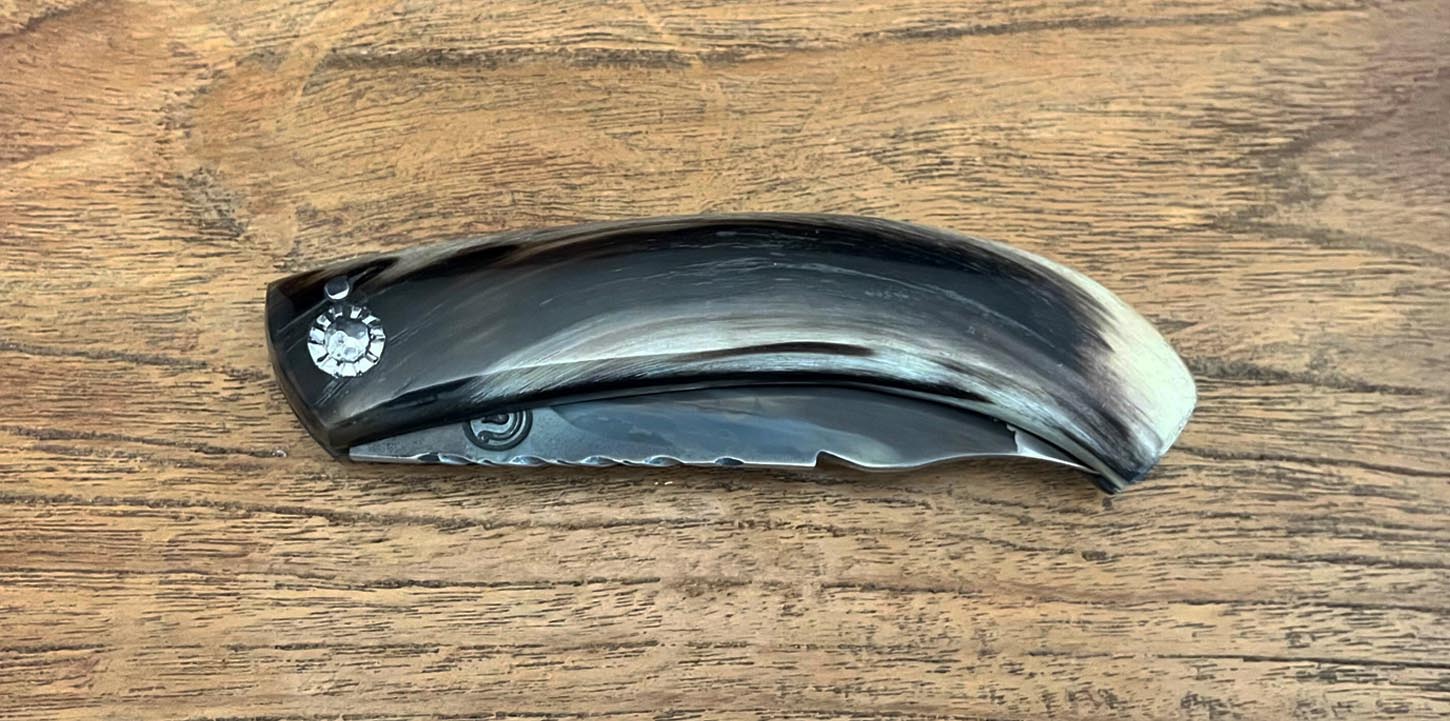 Accueil / Curnicciolu / Curnicciolu lame carbone XC75, corne de bélier Curnicciolu lame carbone XC75, corne de bélier190€ Curnicciolu, lame en acier carbone XC75 et manche en corne de bélier, réalisé par Jean-Noël Guillaumin, pièce unique. Lame : 9 cm En stock quantité de Curnicciolu lame carbone XC75, corne de bélier Acheter maintenant UGS : J-NO 222 Catégories : Curnicciolu, Jean-Noël GUILLAUMIN, Nouveautés Product ID: 7994 Produits similaires Piémontais, lame en acier carbone forgé, manche en corne de bélier 290€ Acheter maintenant Cursinu lame carbone XC75, bois d’olivier 190€ Acheter maintenant Curnicciolu, lame carbone forgée, corne de bouc 650€ Acheter maintenant Cursinu lame carbone XC75, bois d’olivier sculpté 240€ Acheter maintenant