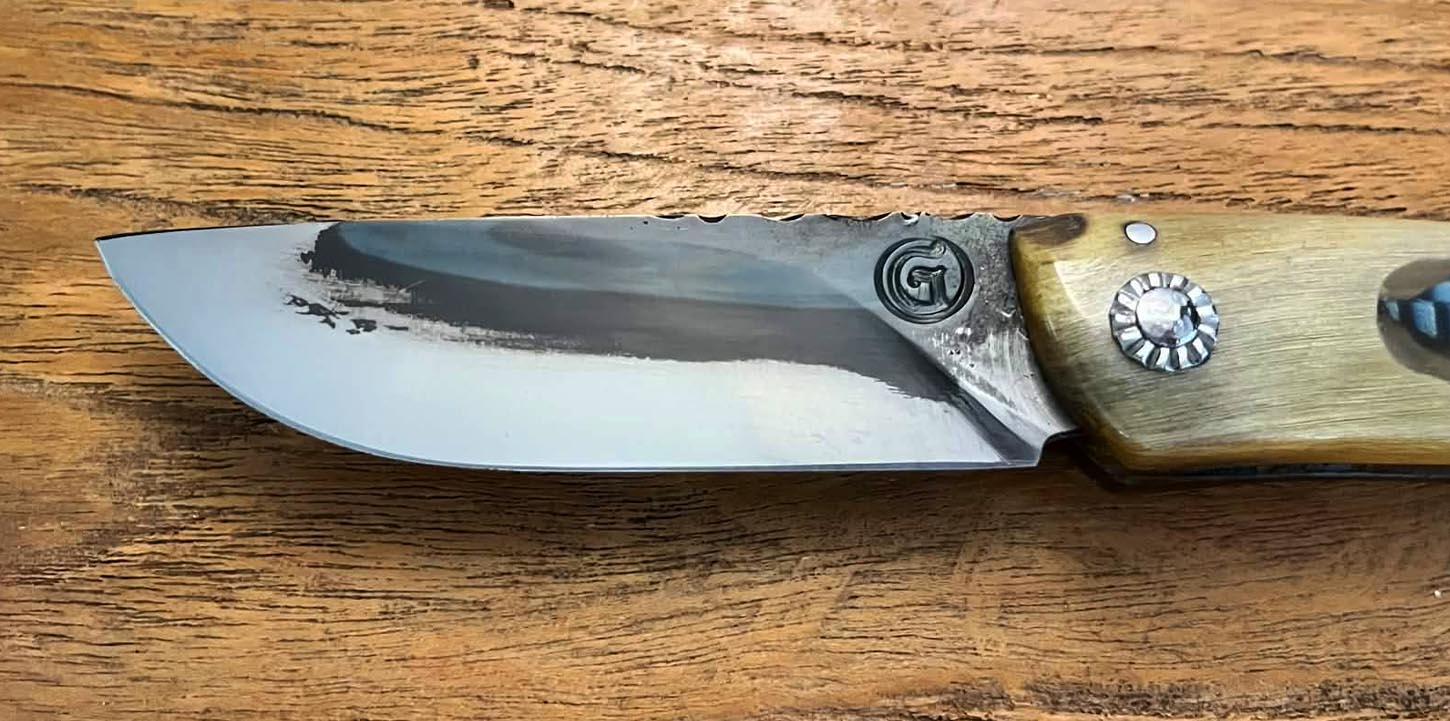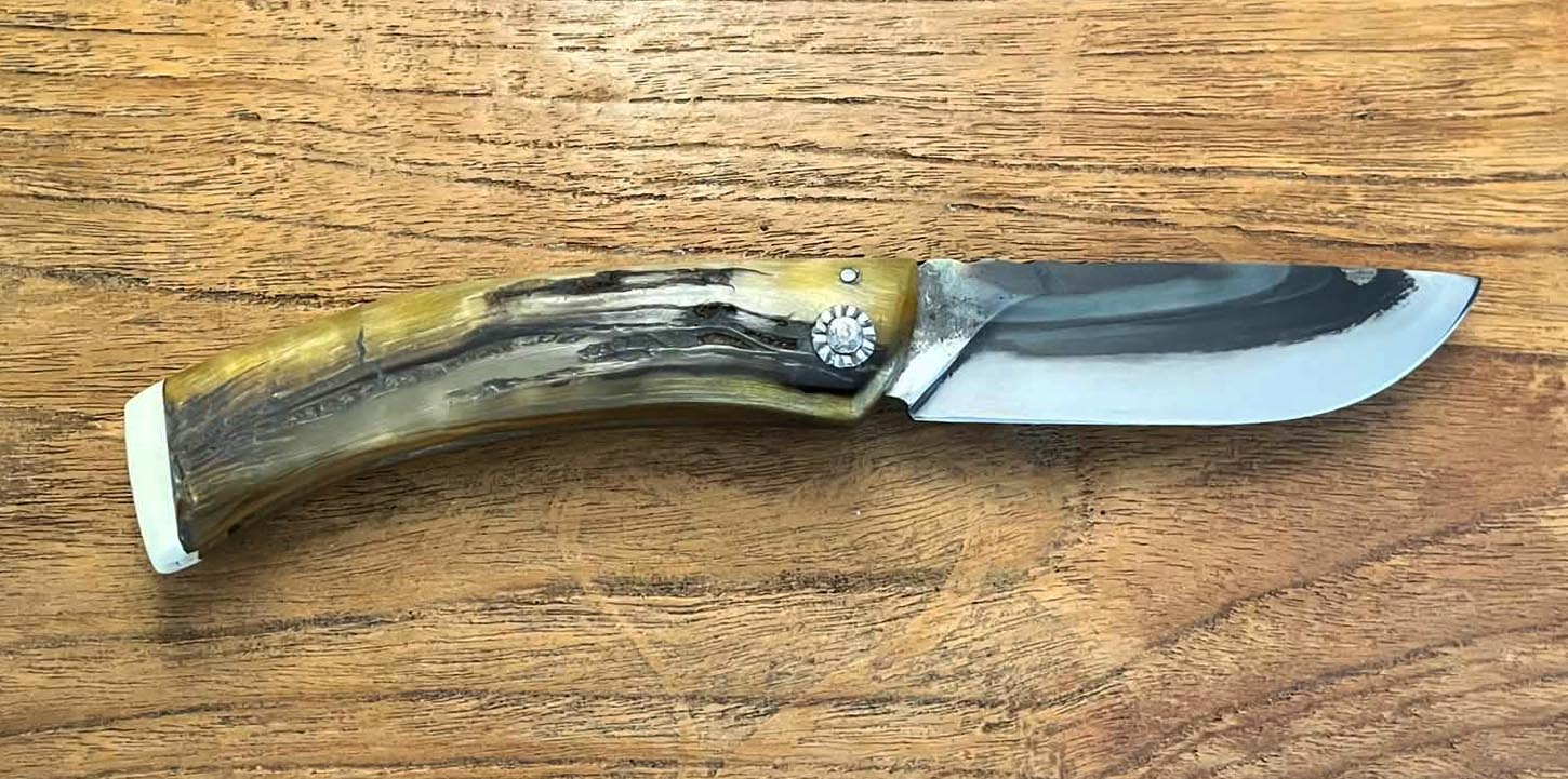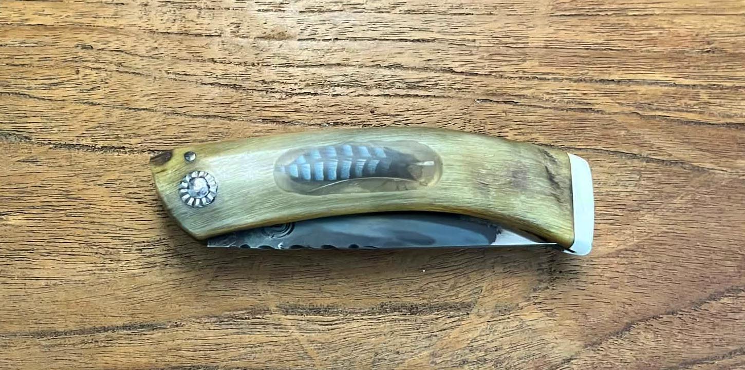 Curnicciolu, lame en acier carbone XC75, corne de bélier, plume de geai et cabochon en dent de phacochère réalisé par Jean-Noël Guillaumin, pièce unique. Lame : 8,5 cm