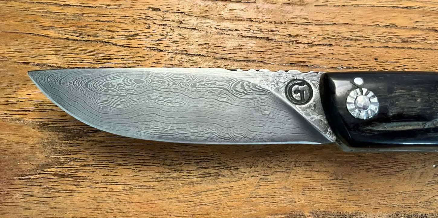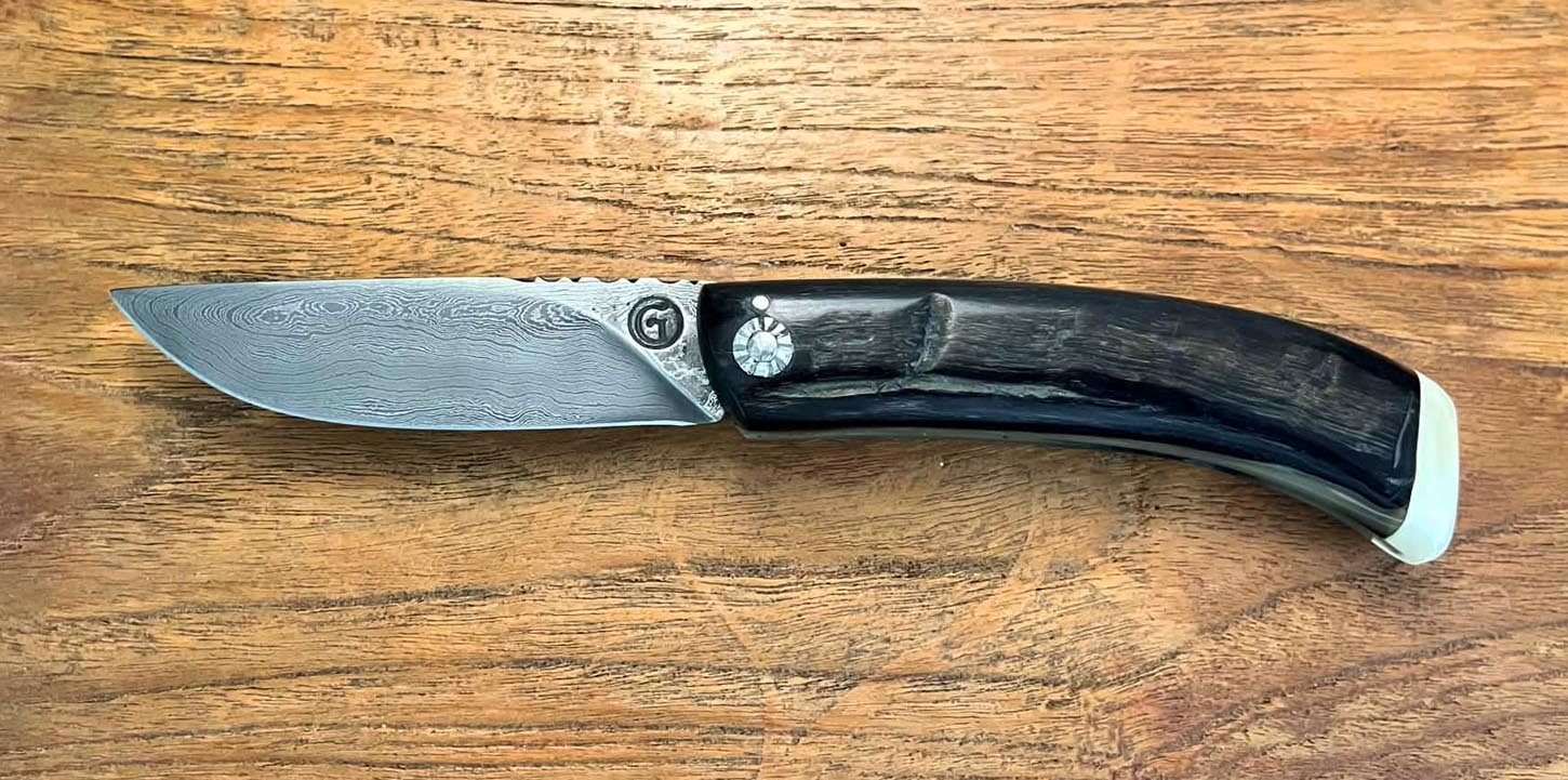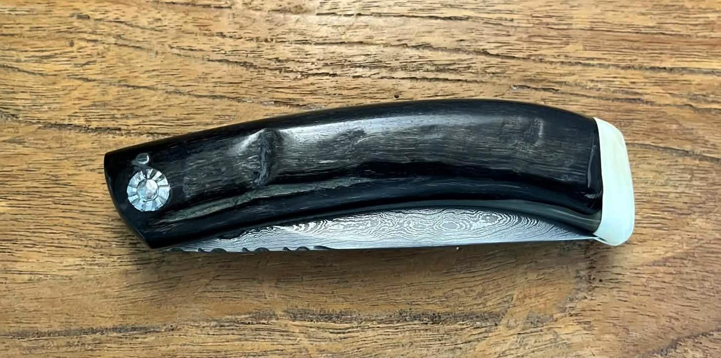 Curnicciolu, lame en acier Damas 320 couches, manche en corne de bélier et cabochon en phacochère, réalisé par Jean-Noël Guillaumin, pièce unique. Lame : 9,5 cm
