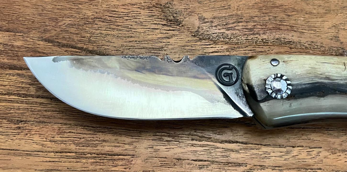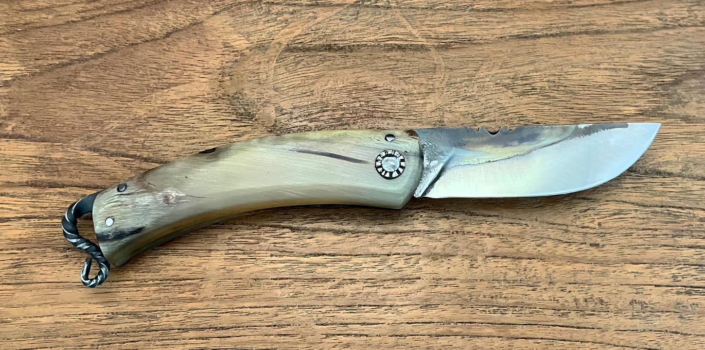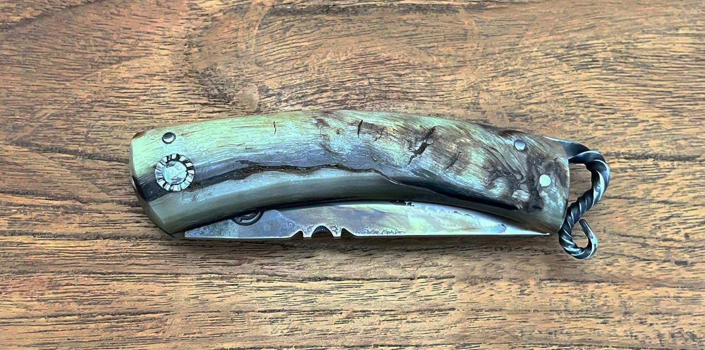 Accueil / Curnicciolu / Curnicciolu Volute, lame carbone XC75, corne de bélier Curnicciolu Volute, lame carbone XC75, corne de bélier220€ Curnicciolu, lame en acier carbone XC75 et manche en corne de bélier avec volute, réalisé par Jean-Noël Guillaumin, pièce unique. Lame : 8 cm En stock quantité de Curnicciolu Volute, lame carbone XC75, corne de bélier Acheter maintenant UGS : J-NO 227 Catégories : Curnicciolu, Jean-Noël GUILLAUMIN, Nouveautés Product ID: 8019 Produits similaires Cursinu lame carbone XC75, bois d’olivier 190€ Acheter maintenant Curnicciolu lame carbone XC75, corne de bélier 190€ Acheter maintenant Curnicciolu, lame carbone forgée, corne de chèvre 700€ Acheter maintenant Piémontais, lame en acier carbone forgé, manche en corne de bélier 290€ Acheter maintenant